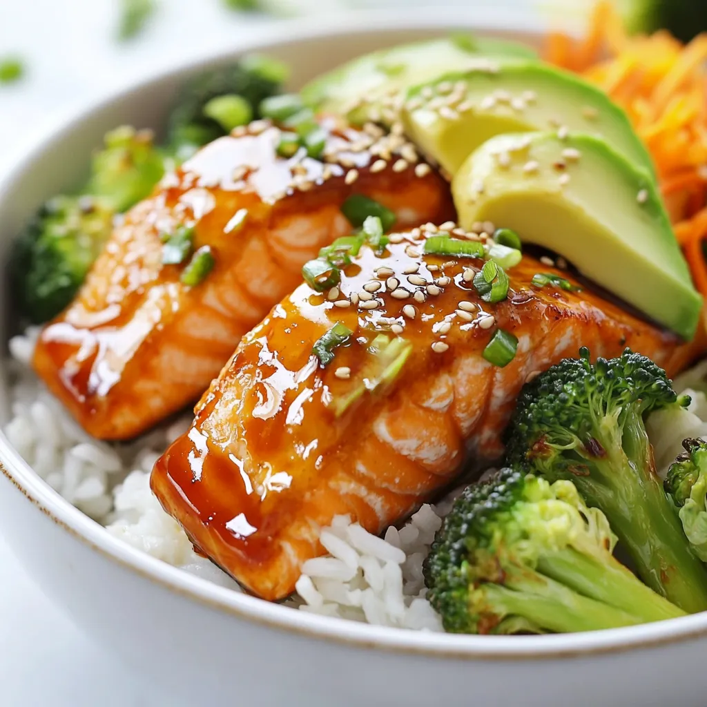 A delicious and healthy rice bowl featuring teriyaki salmon, fresh vegetables, and avocado.