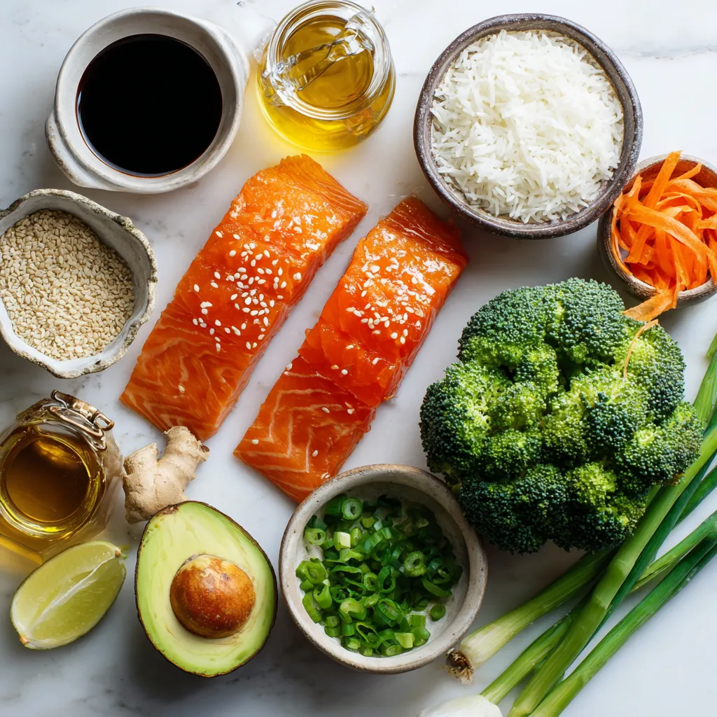 The main ingredients in this dish are simple yet flavorful. Salmon fillets provide rich taste and protein. Jasmine rice adds a light, fluffy base. Broccoli and carrots bring color and crunch to your bowl.
