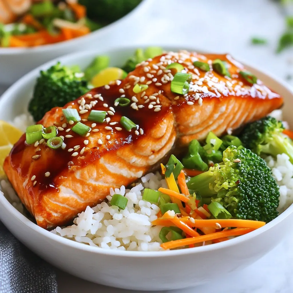 A delicious and healthy dish featuring salmon fillets glazed with teriyaki sauce, served over jasmine rice with steamed vegetables.