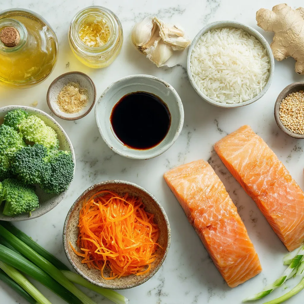 When I make Teriyaki Salmon Rice Bowls, I start with the main ingredients. I choose fresh salmon fillets, jasmine rice, and vibrant veggies like broccoli and shredded carrots. These ingredients give the dish a rich taste and bright colors.