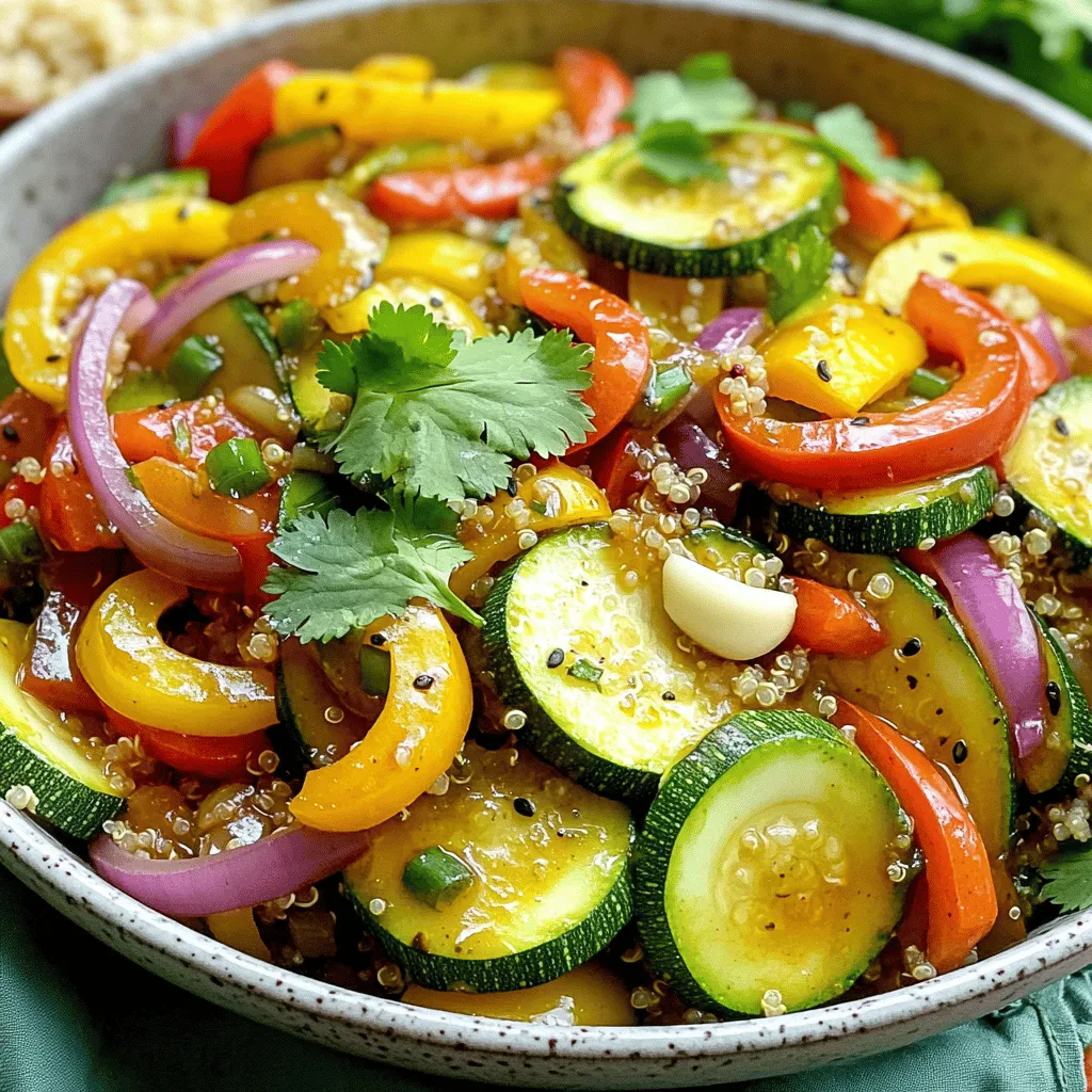 Start by heating the olive oil in a large skillet over medium-high heat. Once the oil is hot, add the sliced zucchini. Sauté it for about three minutes until it starts to soften. Next, add the sliced red and yellow bell peppers along with the sliced red onion. Stir-fry these veggies for another four to five minutes until they are tender-crisp.